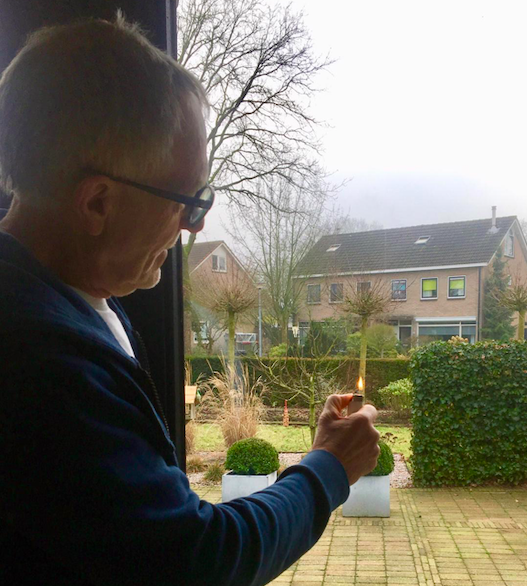 Na wat zoeken haalt Geert een aansteker uit de la van de tafel die hij vervolgens bij het raam houdt. “Kijk, je ziet het vlammetje nu weerspiegelen in het glas, één van de ramen laat echter een geel vlammetje zien, en de ander een rood vlammetje. Dat komt door dat speciale folie. Leuk he? Het staat trouwens ook vaak gewoon in het venster hoor,” lacht hij.