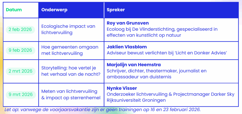 Vanaf februari 2026 staan er 4 online bijeenkomsten op het programma. Deze bijeenkomsten zijn op maandag van 19.30 tot 20.30 uur via Zoom. Iedere sessie duurt 1 uur met eventueel uitloop voor vragen. Tijdens deze bijeenkomsten verdiep je je kennis over lichtvervuiling. Zo leer je alles wat je moet weten als Nachtwachter!